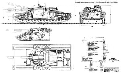 A project for a light tank with the T-100 armament. Jointly developed by Research Institute No. 100 and GSKB-47 (State Specialized Design Bureau) in the mid-1960s. The vehicle featured decent armor that could protect it from 90-mm shells (in case of frontal impact) at any distance.